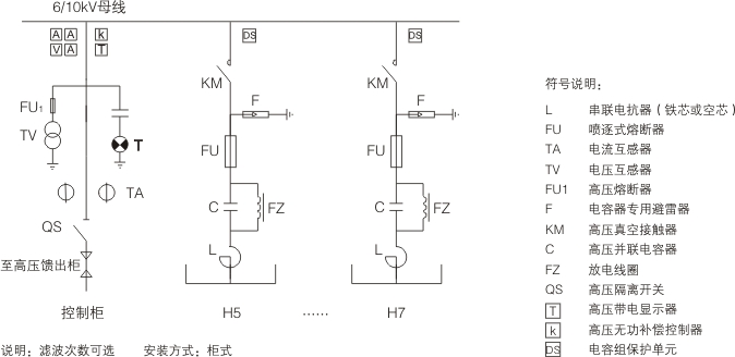 高壓FC每個支路由真空開關(guān)、濾波電容器、濾波電抗器、放電線圈、電流互感器、避雷器等組成。